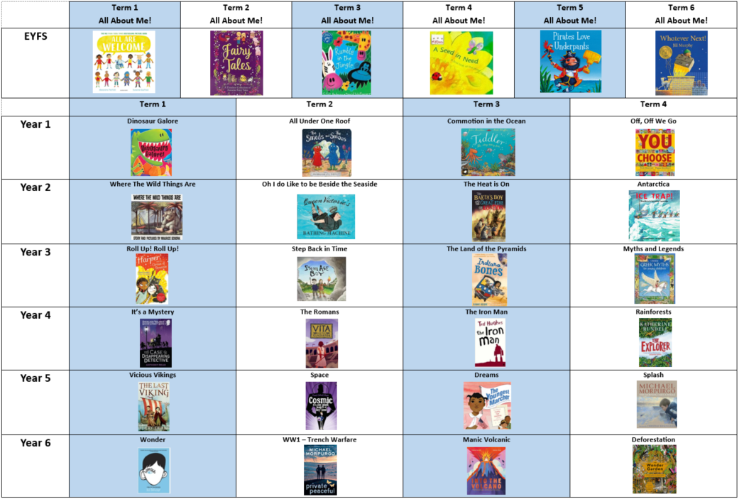 At our school, we believe that a love of reading is the foundation for a lifelong love of learning. Our curriculum is built around high-quality, texts that spark curiosity, deepen understanding, and bring learning to life. Each topic is driven by a rich and engaging book, which acts as a springboard for cross-curricular exploration—from history and science to art and geography. These texts not only provide a window to develop essential literacy skills but also provide meaningful contexts for children to connect, question, and grow as confident learners. Alongside these text are other supplementary texts which further support learning within subjects - these are found in the year group overviews.